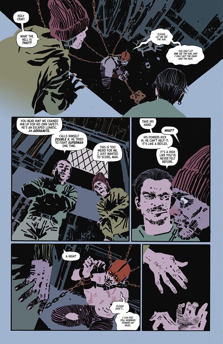 The interiors here are dark, moody and a bit insane in their own right. It fits the subject matter exceptionally well. The linework is bold, thick and how it brings about the detail within the work is amazing to witness. There’s this creativity and imagination on display, mainly when it comes to Double X, that really takes us outside the box of what we think and shows us so much more that’s possible. The way that backgrounds enhance and expand the moments or how the composition within the panels brings out this depth perception, sense of scale and the overall sense of size and scope to the story is wonderfully handled. The utilisation of the page layouts and how we see the angles and perspective in the panels shows an interesting eye for storytelling. The various hues and tones within the colours being utilised to create the shading, highlights and shadow work are so well rendered.