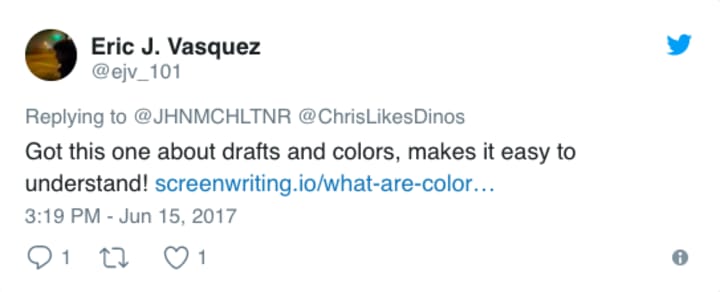 The whole color coding has caused uproar on the twitterverse, with various people pointing to the fact that yellow actually indicates a third rewrite of a scene. Whether first, third, or fiftieth rewrite, it surely has to be taken as a good sign for any script — remember, there is always room for improvement.