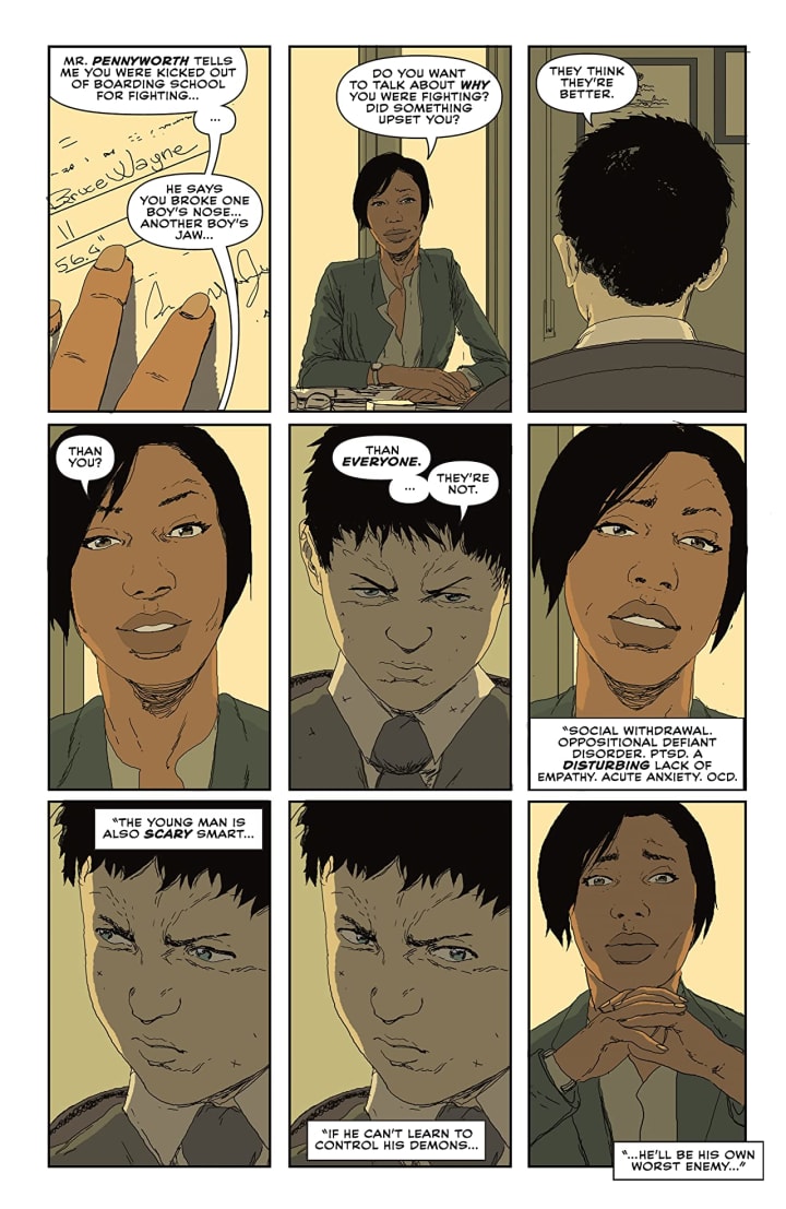 Wow what a difference this is to how Bruce grew up in the “regular” universe. With a few tweaks suddenly he’s a completely different kind of man than what we’re used to and I have to say I’m not entirely sure which version I’m more partial to. Bruce’s acting out as an eleven year old boy is completely normal and natural after being there and witnessing his parents murder. Not so much however was what we learned of the other folks who supported Bruce during those years. What I really appreciate about this issue is the fact that Mattson really takes the reader off page in how they are engaged in this story. You go between what you’ve known and what is presented and begin to see the larger picture of who Bruce Wayne is and what he could’ve become, even going so far and seeing him as the Owlman of Earth 3.
