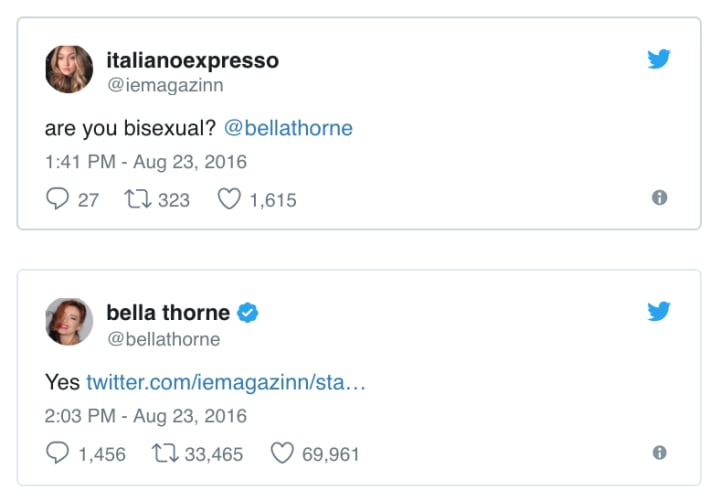 This last month has been a fairly busy month for the former Disney starlet. After breaking up with her boyfriend of about a year earlier this month, Thorne took to Twitter and was asked outright by a fan if she was bisexual. Her answer was a simple, "Yes".