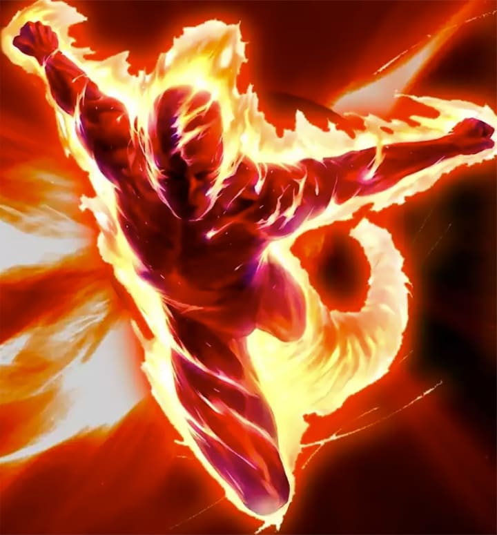 The Human Torch, otherwise known as Jonathan “Johnny” Storm, was hit by cosmic rays in his spacecraft which gifted him with amazing powers. Along with engulfing himself in fire, he can also absorb fire into his body and control it with ease. He fights alongside his sister, Susan, her husband Reed Richards, and their friend Ben Grimm. With the catchphrase, “Flame on,” he can immediately engulf his boy in flames for battle.