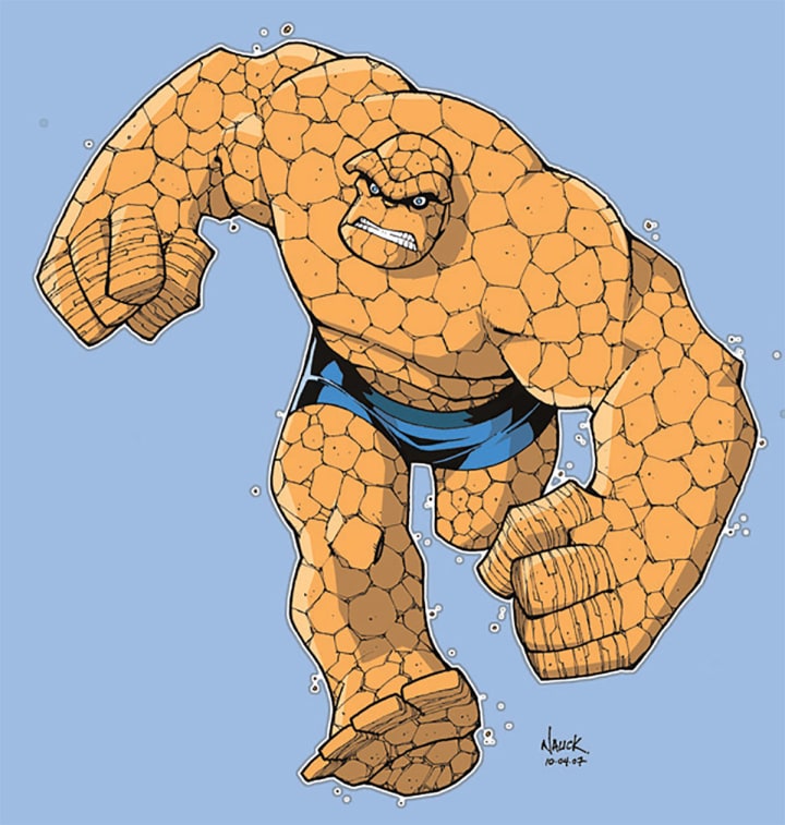 The Thing, also known as Ben Grimm, is one of the main members of Marvel’s The Fantastic Four. He is known for his rock-like orange body and his trademark sense of humor. He gained his superpowers after being exposed to cosmic radiation. This caused him to develop his rock-like hide, as well as his super strength, resistance, and stamina. His superhero catchphrase is used as a battle cry. He often shouts, “It’s clobberin’ time” right before starting (and mostly winning) a fight.