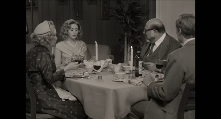 There are two guests at the dinner table. It seems like their neighbors, but we do not know yet. Or could it be some figment of their imagination that was created by Agatha? I think Agatha is trying to tell them something as they mention marriage, and none of them can remember anything about how and when they get there. As she pokes Vision’s head when he stands next to her car, we can see after she flicks and said he is dead, he realizes something.
