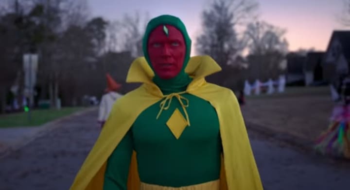 And of course, we get an ode to the original costumes of Vision and Scarlet Witch. Vision is walking on the street with his costume and sees that other people are in costumes trick-or-treating. So they must have dressed up for Halloween.