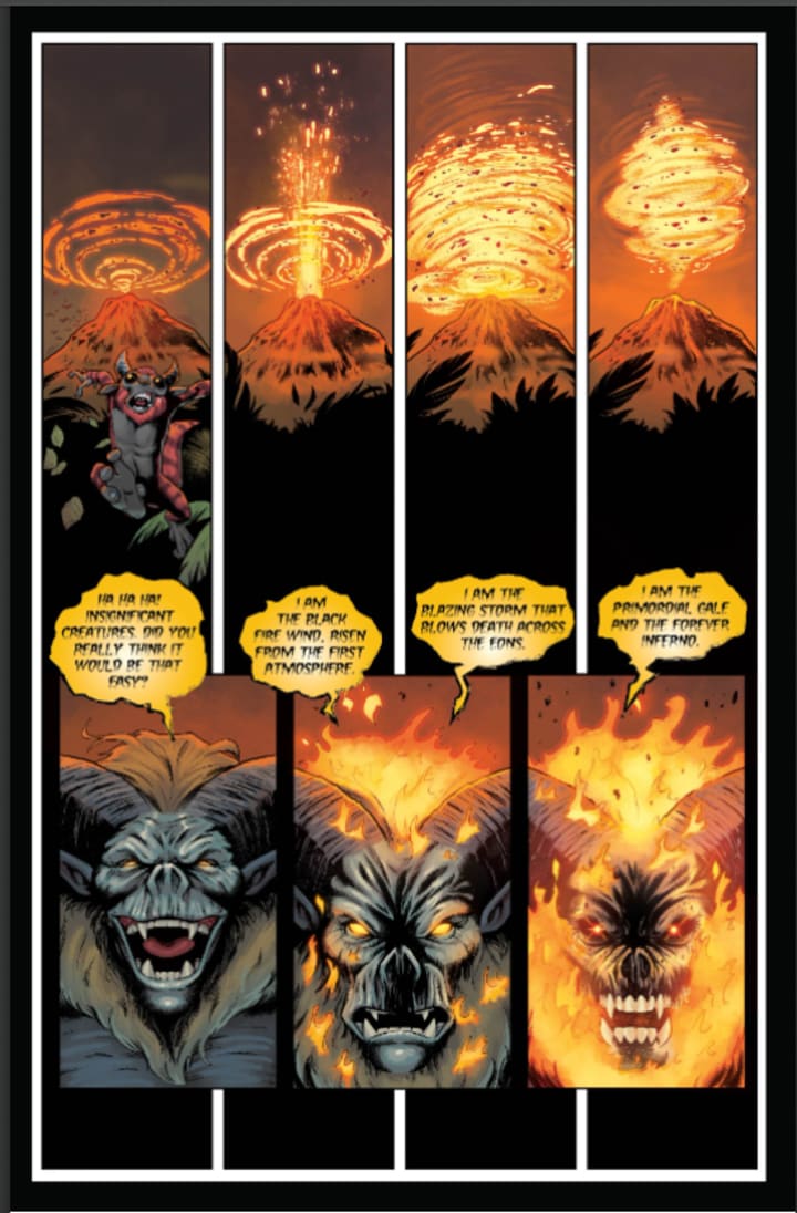 I am a huge fan of the interiors here. The creativity and imagination that we see throughout the book is utterly sensational, I mean to see Pazuzunox transform, the winged hairless cats, and the myriad of weaponry that the horns are able to create is mind blowing to witness. The linework is amazing and how we see the varying weights and techniques being utilised to create this level & quality of detailed work is astonishingly well rendered. The utilisation of backgrounds and how they enhance and expand the moments as well as how they work within the composition of the panels to bring out the depth perception, sense of scale and the overall sense of size and scope to the story. The utilisation of the page layouts and how we see the angles and perspective in the panels show a remarkably talented eye for storytelling. The colour work is brilliantly rendered. How we see the various hues and tones within the colours being utilised to create the shading, highlights and shadow work shows a sensational eye for how colour works and how to maximise its effects.