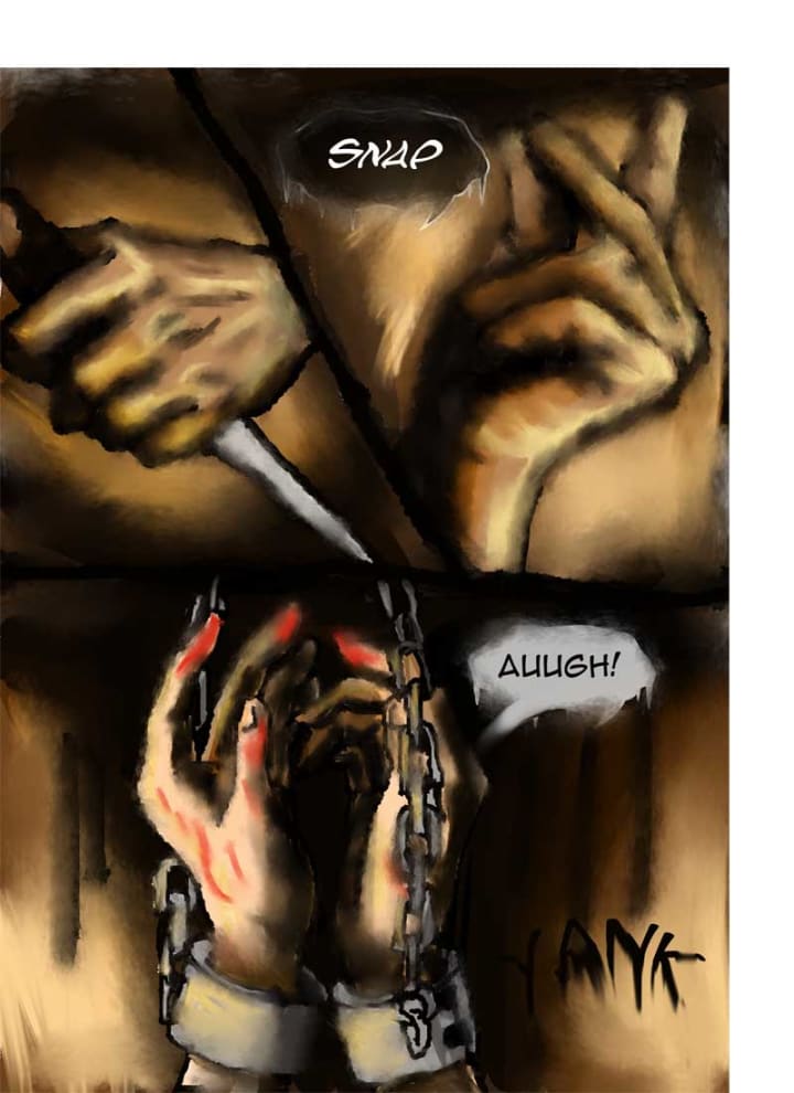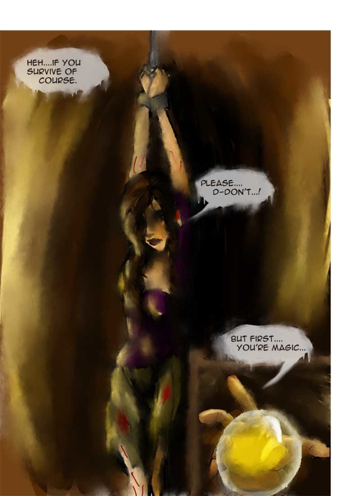 The door opened and a man with a thin dagger snapped his fingers. The torches all lit up and her chains instantly yanked her up from the floor. Her mangled body screamed in protest, every fiber on fire. Her evil captor chuckled at her misery and sang,