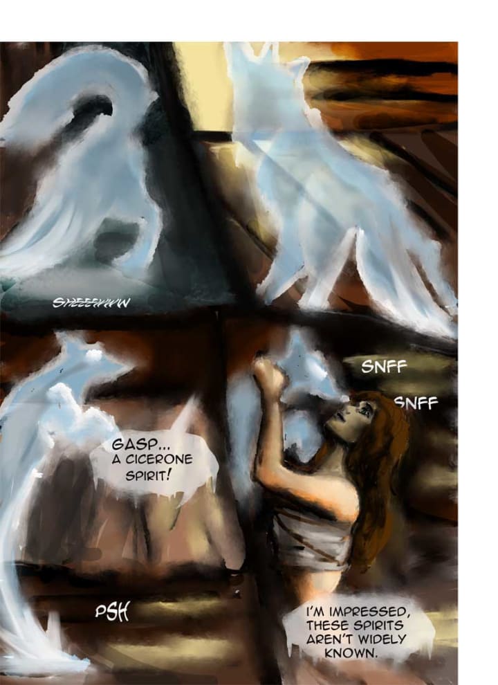 “I’m impressed, these spirits aren’t widely known.” Randolf replied with a chuckle. “He’s very clever.” The cicerone spirit sniffed her again then bounded back from where it came. “Don’t worry Klara. If anyone can find the amulet, he can.”