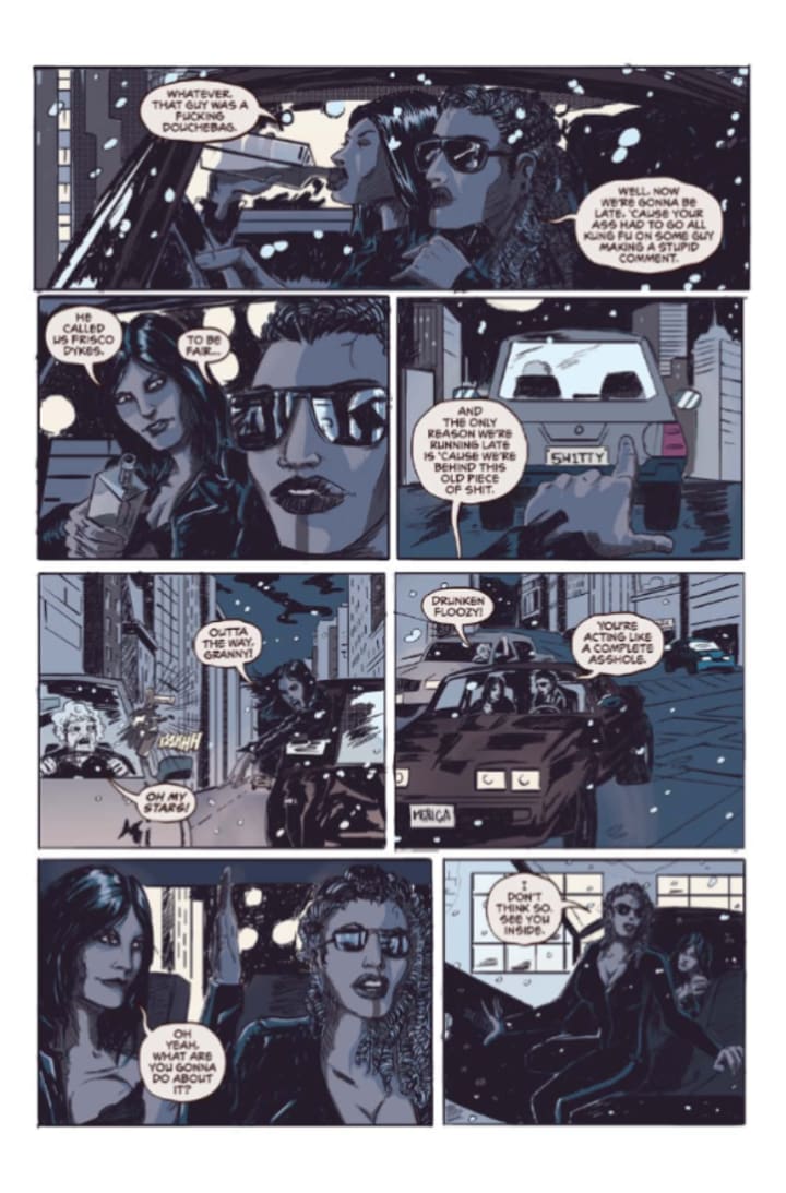 Love, love, love the interiors here. I have to say that opening and every single moment after leaves such an impression upon the reader. The linework is clean, crisp and strong and how we see the varying weights and techniques being utilised to create this wonderful detail work is amazing. So backgrounds could be utilised better and i’m gonna lie or sugar coat how much the blank spaces feels like wasted opportunity to me. We do see some nice depth perception, sense of scale and the overall sense of size and scope of the story is rendered nicely. The utilisation of the page layouts and how we see the angles and perspective in the panels show a smart eye for storytelling. The colour work is nicely rendered as well. How we see the colour blocking is really well done and how we see the colour packed in like a tattoo artist would do has its own charm as well. The various hues and tones within the colours that we see being utilised to create the shading, highlights and shadow work are rendered extremely well.