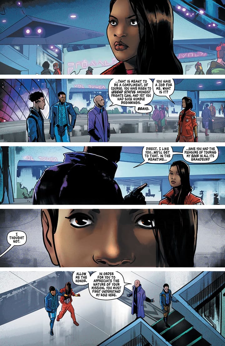 The interiors here are really exemplary. The linework is incredible and how we see the varying weights and techniques being utilised to create this level & quality in the attention to detail is truly outstanding. How we see backgrounds being utilised to enhance and expand the moments as well as how they work within the composition of the panels brings out the depth perception, sense of scale and the overall sense of size and scope to the story. The creativity and imagination that we see throughout the book is marvellous and that gateway for instance is utterly gorgeous. The utilisation of the page layouts and how we see the angles and perspective in the panels show a remarkably talented eye for storytelling. The various hues and tones within the colours being utilised to create the shading, highlights and shadow work shows a superb understanding of how colour works.
