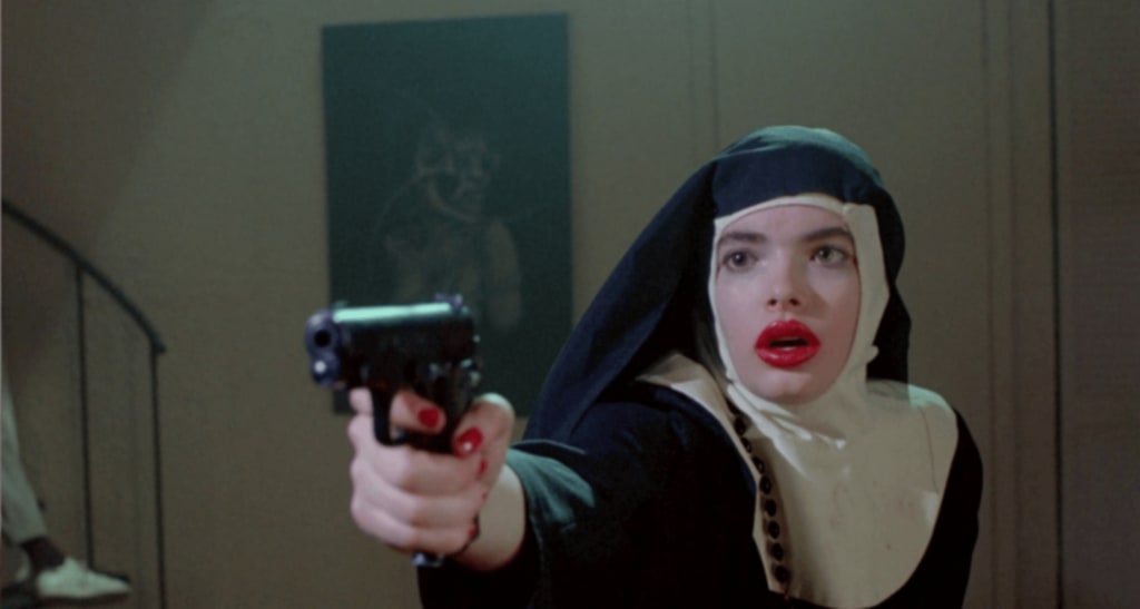 All of this violence builds to a crescendo at a Halloween party where Thana, dressed as a nun, we'll come back to that, first murders her lecherous boss and then shoots any man who crosses her sight before she is literally stabbed in the back by one of her female co-workers. Thana dies, betrayed and managing with her last breath to utter the word, 'Sister.'