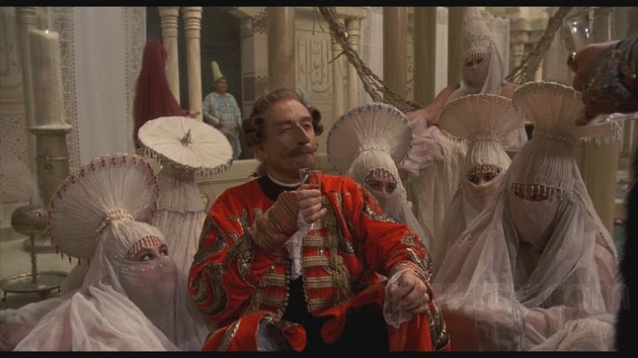 The story of The Adventures of Baron Munchausen begins on the stage where an acting troupe is acting out the supposedly fictitious adventures of Baron Munchausen. The story kicks into gear when the real Baron Munchausen (John Neville), charges the stage and demands to be allowed to tell the story of his adventures correctly. Thus, the Baron launches into a fantastical story about his conflict with the Grand Turk, one that began with a reasonable wager and ended with the Baron and his men leaving with all of the wealth of the empire.