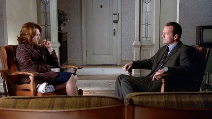 In The Sixth Sense, Bruce Willis plays Dr. Malcolm Crowe, a prominent and well-respected Child Psychiatrist. On the night that he’s been honored for his work by the City of Philadelphia, his house is invaded by a former patient named Vincent (Donnie Wahlberg, in an unexpectedly brilliant cameo). Vincent shoots Malcolm before taking his own life. The film then leaps forward more than 6 months. Malcolm, having survived the shooting, is back to work trying to help a new child patient named Cole Sear.