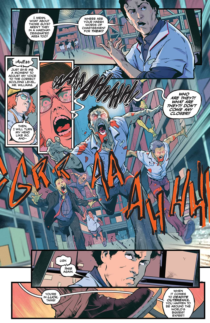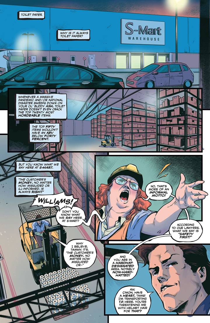 The interiors here are pretty bloody brilliant if I may say so. The linework is exquisitely laid down and how we see the varying weights and techniques being utilised to create this level and quality of detail work is astonishingly well done. That Ash looks like a young Bruce Campbell is so utterly amazing to see. There are iconic poses throughout that feel like they are in the most perfect spots. The utilisation of backgrounds makes me happy and how we see them work within the composition of the panels to bring us depth perception, a sense of scale and that overall sense of size and scope to the book is flawlessly rendered. The utilisation of the page layouts and how we see the angles and perspective in the panels show such a masterful eye for storytelling. The colour work is gorgeous as well. The various hues and tones within the colours being utilised to create the shading, highlights and shadow work is so well rendered. From gradation to colour blocking what we see is so well laid down and makes such an impact to the story its bloody brilliant.