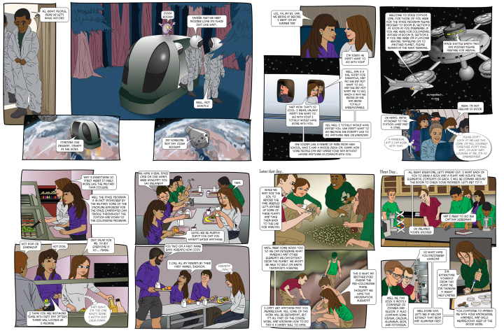 This story is first seen through the lens of Judy Mendelsohn. Being a curious teenager, she hopes to join the space program to help colonize other planets. Earth is getting hotter and extremely crowded. But Judy has an altruistic spirit that’s infectious. From her sexuality to her love for new adventures, Judy is someone who you want to see experience life. As both writer and artist, Kerri Schiff has paced the narrative to show a natural progression of what happens in an intelligent, young woman’s life. Judy falls in love hard, unapologetically wears her love for science on her sleeve and has a good relationship with her family. Essentially, as a reader you’re engulfed in a world where you can logically feel a part of.