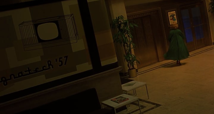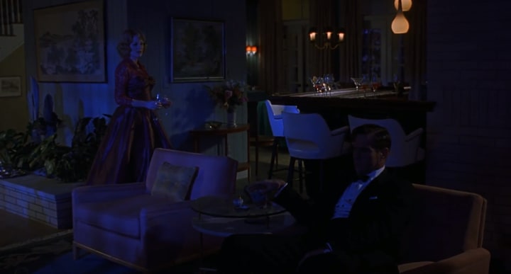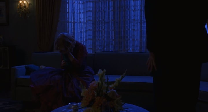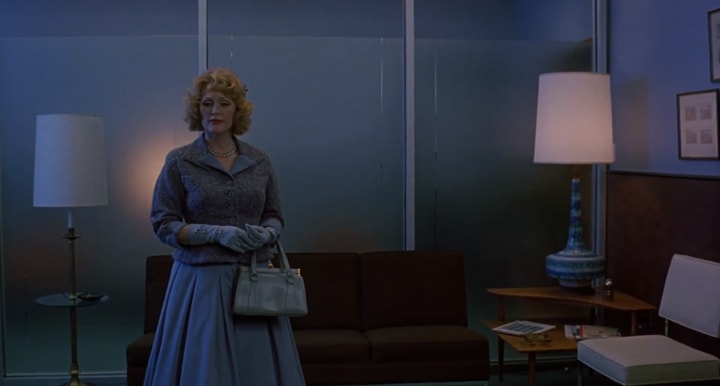 This colour blending is “an exaggerated replica of a common Sirk effect: by keying a woman’s clothing to the setting, Sirk merges her into her environment,” (Willis 2003). The outfit Cathy wears for Frank’s first visit to the doctor [shown below] is also striking because it bleeds into the setting (Bordwell and Thompson 2013) - Her gorgeously put together outfit offer a subtle range of bluish and purplish tones that harmonize perfectly with the colour scheme of the doctor’s waiting room (Willis 2003).