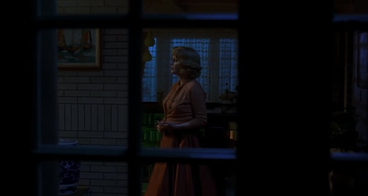 Much of the impact of an image comes from the manipulation of lighting (Bordwell and Thompson 2013). Far From Heaven has a lot more lighting variety compared to other films of its time. Haynes uses unnatural and bright lighting to depict marital dysfunction. Far From Heaven takes place over several seasons and the ambient night light changes as the seasons change; which is a metaphor for what the characters are experiencing emotionally. For the autumn scenes in the beginning, the night light is a lavender or periwinkle blue, but as Cathy and Frank’s relationship deteriorates, the night light becomes a brighter blue [as shown below].