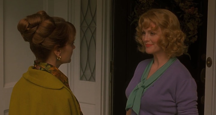 In the scene the morning after Frank strikes Cathy, Eleanor and Cathy are dressed in noticeably contrasting colours [shown below], and this is the first time that their clothes don’t match or harmonize (Willis 2003). In her brown blouse, Eleanor rhymes with the autumnal trees behind her (Willis 2003). Cathy’s attire, however, introduces a striking visual disharmony. She wears a lavender sweater over a minty green dress.
