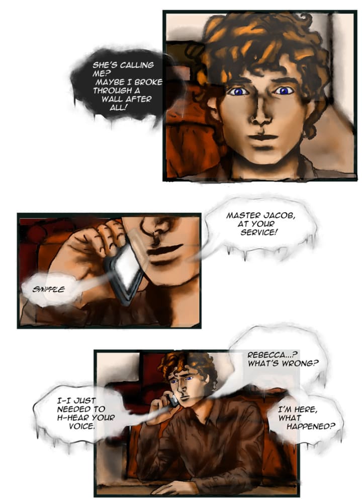 “Master Jacob, as your service…!” Sniffling crying answered him. Humor instantly evaporated and he asked, “Rebecca, what’s wrong?”