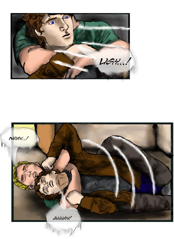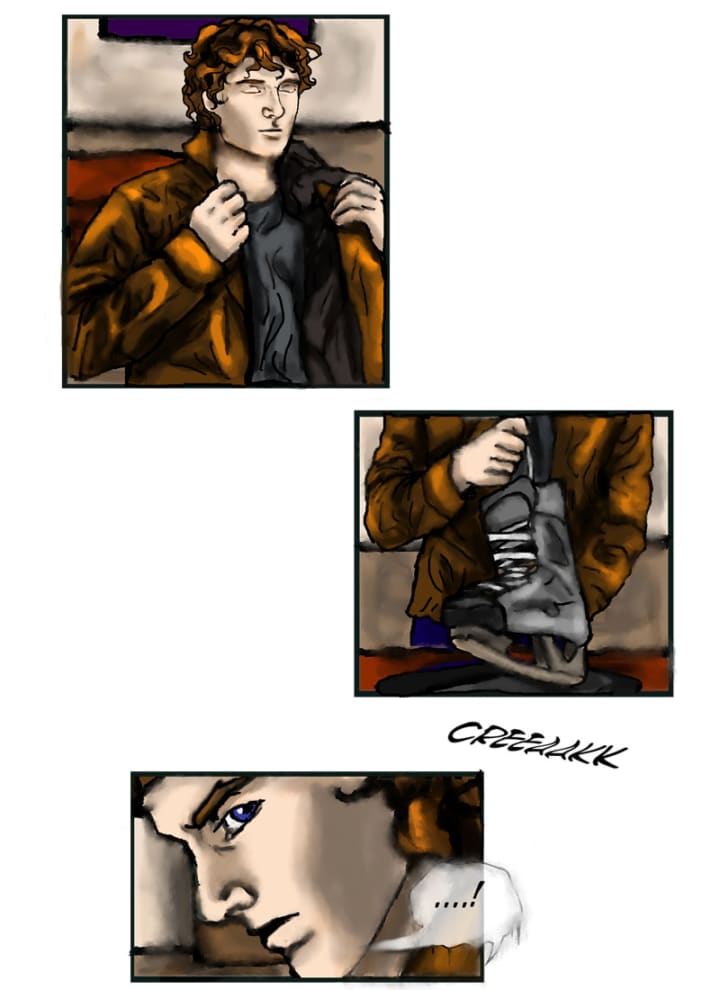 “Great, I’ll be there soon.” He hung up the phone then dashed to the closet to find clean clothes and dig out his skates. As he stuffed them and some extra gloves in a backpack, he sensed a presence behind him. Then an arm wrapped around his neck and he was tackled to the ground, pinned as a young man roared with laughter.