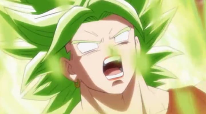 Not only did Kale take on Broly's bulky appearance but her hair, the biggest indicator of Super Saiyan transformations in the Dragon Ball canon, became identical to Broly's. Being his most recognized attribute, the similarities between their hair in Super Saiyan form are uncanny. They're both green with a particular pointed shape, and that's just one similarity. The color of her aura is also another indicator of Kale possessing some connection to Broly.