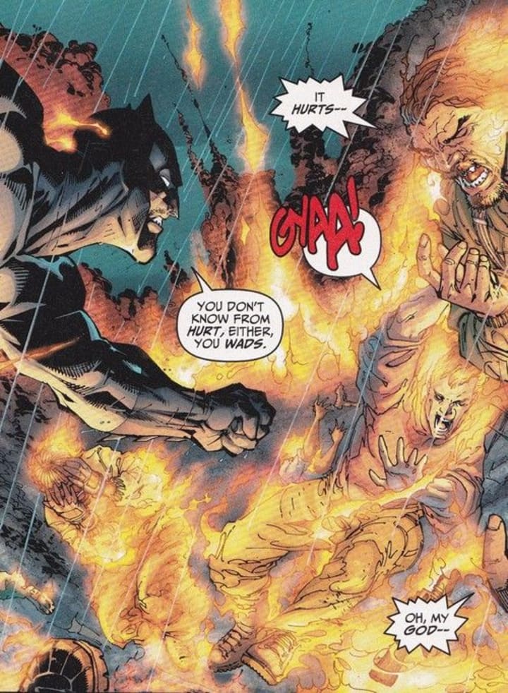 In All-Star Batman and Robin No. 7, 2007, Batman straight of the bat (Yes its a Pun) Begins the issue by burning Criminals! He grabs a bottle of flammable bleach, combines it with thermite and Voila! Guess What flings it into the Goddamn crowd.