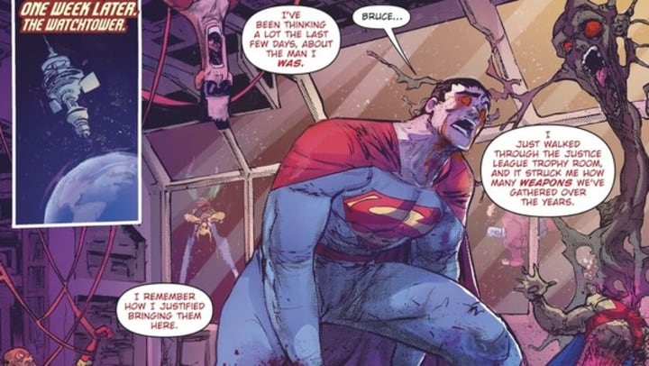 He also savagely kills his entire Family... he invites the entire Bat-Family into the cave to train, the family believed that Batman was training his proteges to defeat his soon-to-be evil self. This was not the case. He instead fills them all with lead...