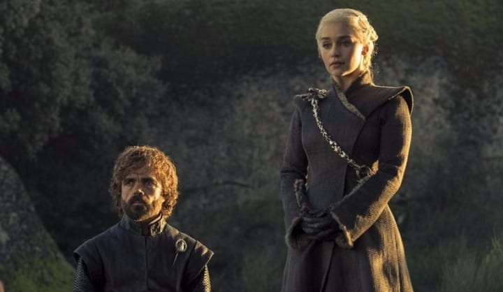 Daenerys Targaryen with Tyrion Lannister, prior to setting Randyll and Diickon Tarly onfire [Credit: HBO]