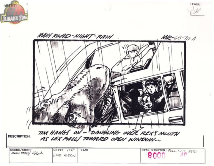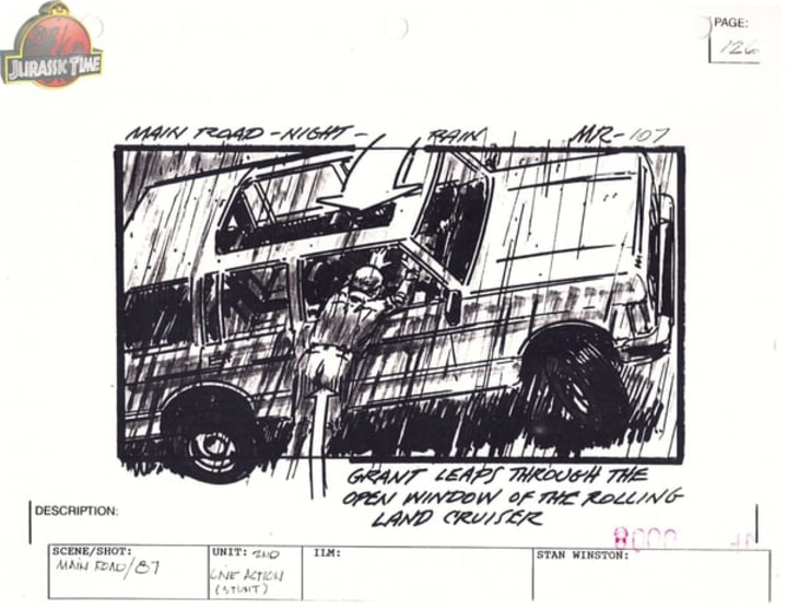 The land cruiser scene ended up being one of the film's most action-packed, but just imagine Sam Neill doing more stunts; Tippet's storyboard sees Grant's cruiser thrown into the enclosure where he is forced to roll through and open window and back out again into safety. Sadly, the first draft doesn't seem to contain the toilet gobbling for Gennaro or that infamous goat leg scene, which, as a 4-year-old boy at the time, scared the bejesus out of me!