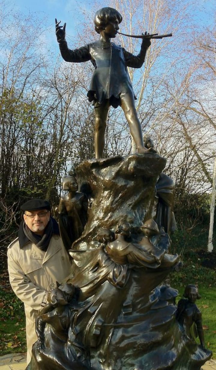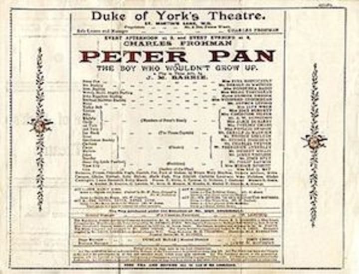 First, we must begin by recognizing that Peter Pan came to notice in the 1904 stage play by James Matthew Barrie, a Scottish author and playwright. It was first performed in London, where he’d previously met the Llewelyn Davies boys, whom he later adopted.