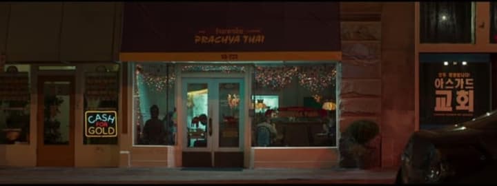 It's not easy to spot, but take a look at the poster on the right hand side. The bottom words are in English, and they read: