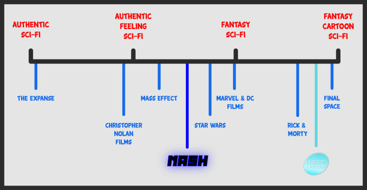 Sci-Fi can go in a lot of directions. I tend to think of it as a scale from the Authentic Sci-Fi to the Cartoon Fantasy Sci-Fi , with various categories in between. I want to talk a bit about this scale, each category (or subgenre) inbetween and where my two series fit into this.