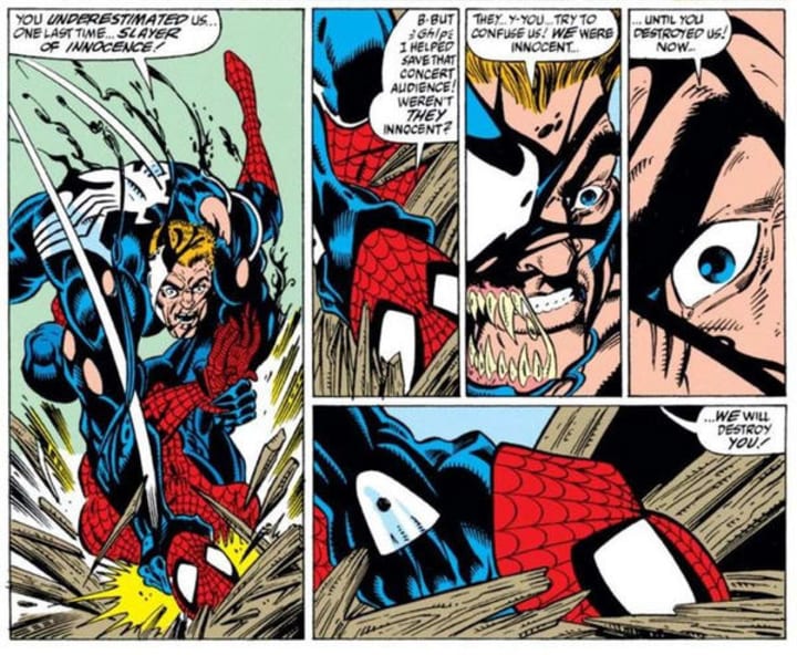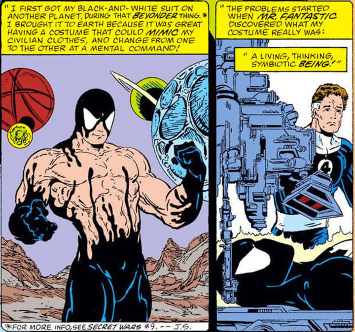 (In the comics, Venom is actually Eddie Brock, a normal guy who comes into contact with an alien parasite from the planet Klyntar. The alien parasite is known as the symbiote, and it consumes the body of its host, turning the host into a mindless being under its control.)