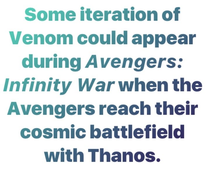 Some iteration of Venom could appear during Avengers: Infinity War when the Avengers reach their cosmic battlefield with Thanos. We have no idea of what else we'll see when the Avengers take on Thanos and his minions, and we don't know where their war will take place either. For all we know, Avengers: Infinity War could take place on Thanos's isolated planet seen in the post-credits scene of The Avengers (2012) or on another distant planet where the symbiotes reside.