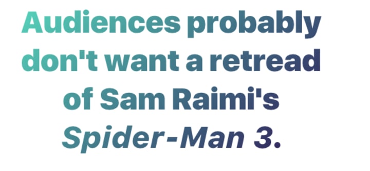 Not all the components of the Spider-Man: Homecoming comic book event are expected to be used in the upcoming film, but with much of it being mirrored, Peter Parker donning the symbiote suit wouldn't be a total surprise. At the same time, audiences probably don't want a retread of Sam Raimi's Spider-Man 3.