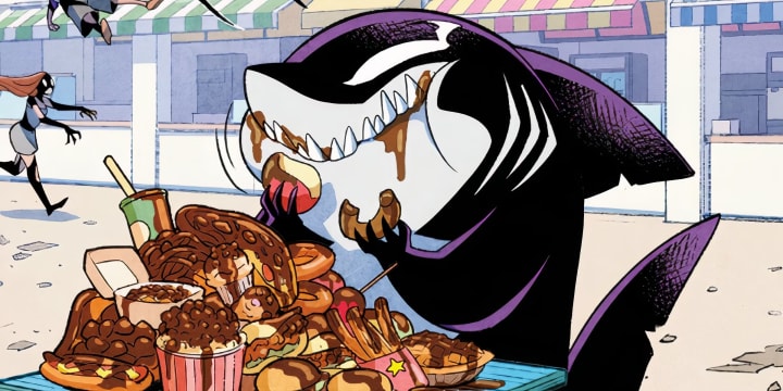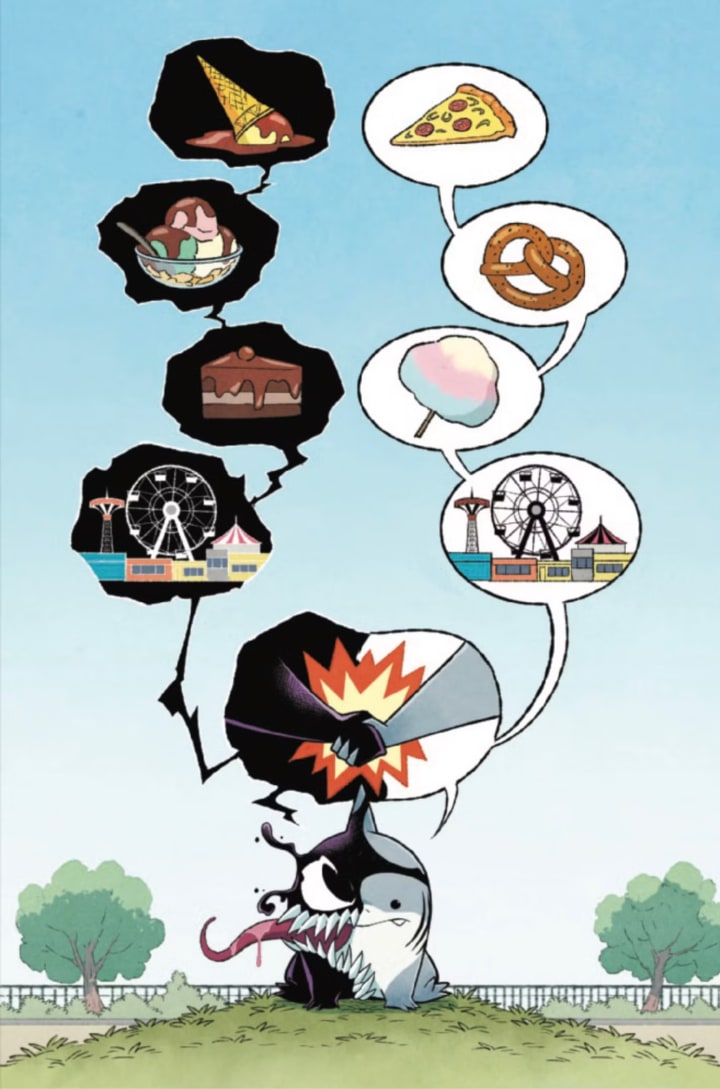 During 2024's 'Venom War' storyline, Jeff, left unsupervised in the chaos of the zombiote invasion, bonds with an alien symbiote. While he initially tries to rid himself of the parasite, Jeff and his symbiote come to an understanding after realizing they both just want food, and decide to work together to get it.