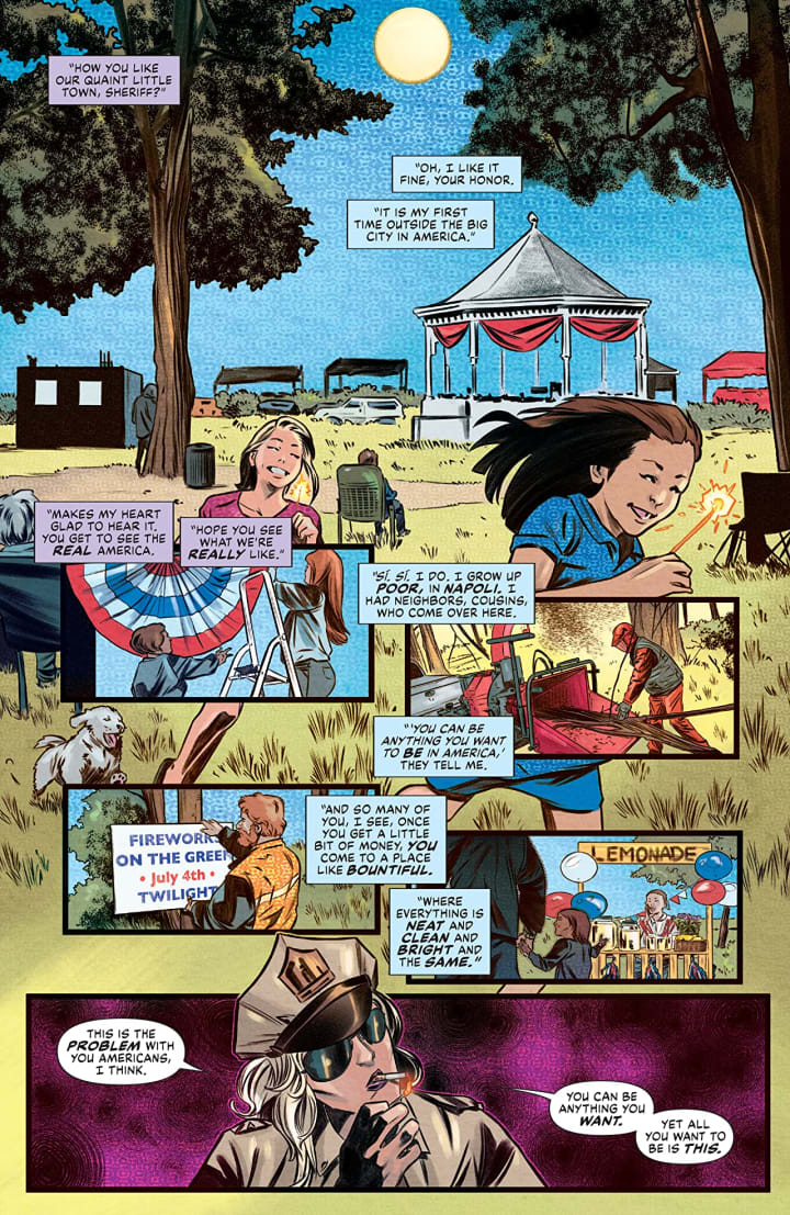 I think this kind of series is sorely missing from the stands right now. She’s like a fixer only; she doesn’t take on clients who are living but for avenging those that have died thanks to the actions of others. That we don’t see a whole lot of things happening outright but through subterfuge so we are basically learning alongside the characters and I love this tactic I think it's brilliantly handled. With some intelligent writing and stunning characterisation all of which is wrapped up in these fantastic interiors make this a surefire standout.