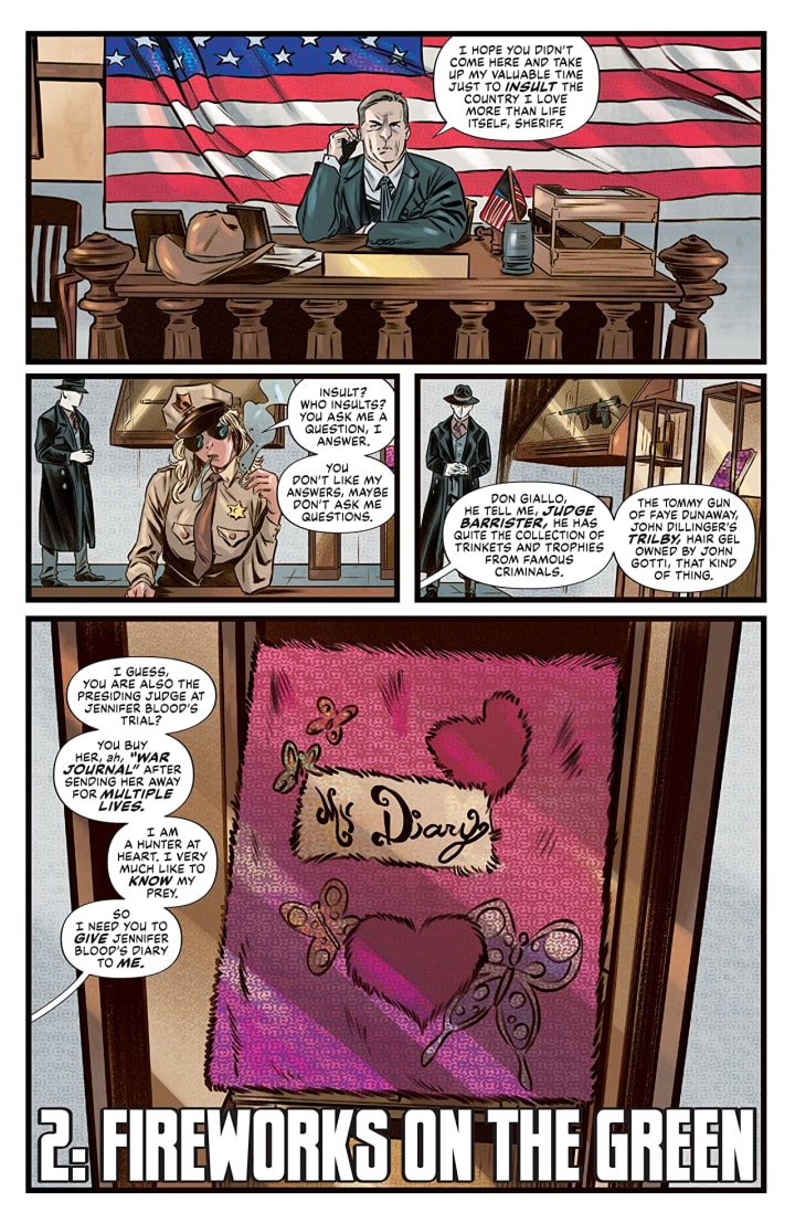 There's a new sheriff in the criminal-run town of Bountiful, and it's Giulietta Romeo, Europe's top hitwoman! Giulietta's hot on the trail of Jennifer Blood, and needs to get her hands on the legendary vigilante's "war journal" to help her--but the crooked judge who has it wants to strike a deadly bargain for it! It's the annual Fourth of July celebration in Bountiful, and you can bet Jennifer Blood is bringing the fireworks!