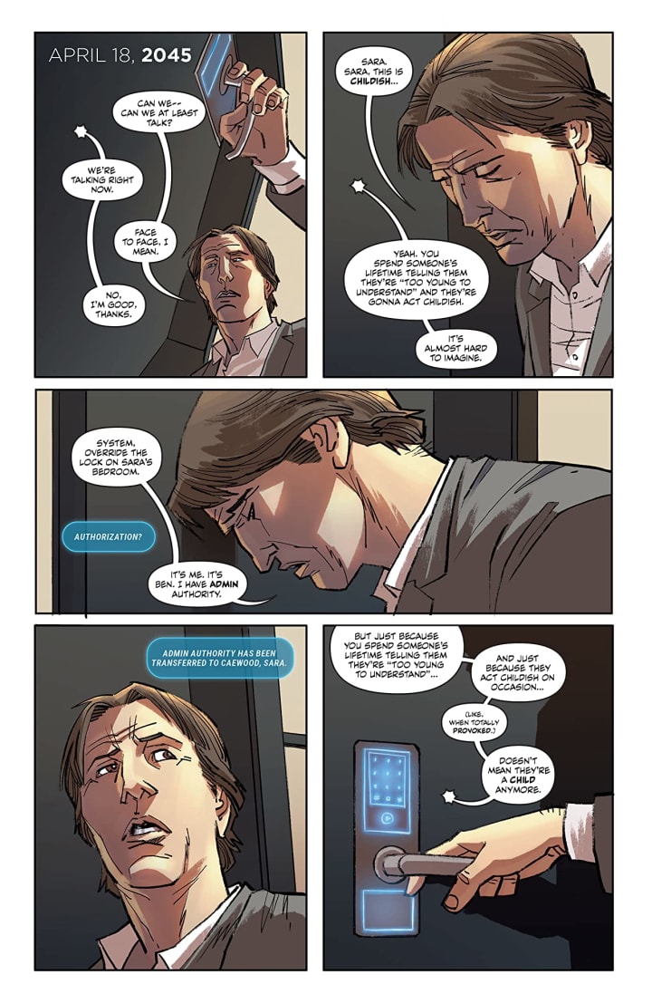 So is Sara just being obstinate and Ben being overly hopeful given that the other one will do as they are told? I mean if the Earth is really dying why would she stay, just to spite her father? That’s cutting off your nose to spite your face. On the other hand, assuming she’s going to leave because he wants her to, well, that’s just incredibly naive on his part. The issues these two have would take more years than either of them have to live to work out and something is going to have to give here. Again as a reader I go off page and this level of engagement is masterfully crafted by Marc. The writing is superb and the characterisation is flawless while the interiors bring it all to life with such incredible ease.