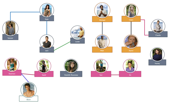 The chart above describes the relationships between our survivors. The light blue being "friendship", the green being "antagonist", the pink color of the name boxes and the pink lines indicate a romantic connection. And the gold name boxes indicate familial realtion. As you can see Boon and Shannon have their own color because their relationship is...different.
