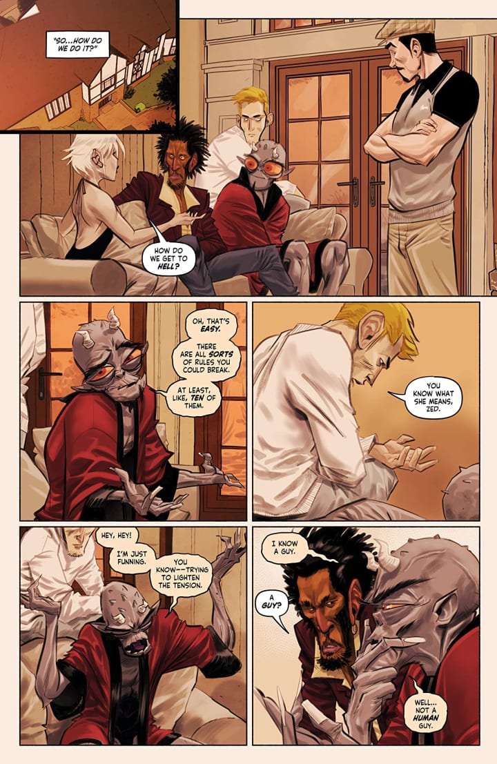 The interiors here are fantastic. The linework and how we see the varying weights and techniques being utilised to create the detail within the work we see also gives it this very unique style to the work. I personally would like to see more backgrounds being used as they do tend to enhance and expand the moments. That being said, the way that we see composition within the panels brings out the depth perception, sense of scale and the overall sense of size and scope to the story does make up for a lot. The utilisation of the page layouts and how we see the angles and perspective in the panels shows an extremely talented eye for storytelling. The various hues and tones within the colours being utilised to create the shading, highlights and shadow work shows a great understanding of how colour works.