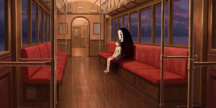 The train scene is a high-ranking favourite amongst film fans and it’s interesting because it is a scene where nothing actually happens. Although absent of any important events or plot information, the scene is far from unnecessary, quite the opposite in fact because by this point, Chihiro has been through a lot. Her life has been threatened at every turn and the initially aggressive spirit whom she befriends, known as No-Face, has made it his mission to gain her affection. His method to achieve that is by eating other beings which grants him their personality and physical traits, and also protects her. However he has eaten so many by this point that he has become a greedy, self-involved monster.