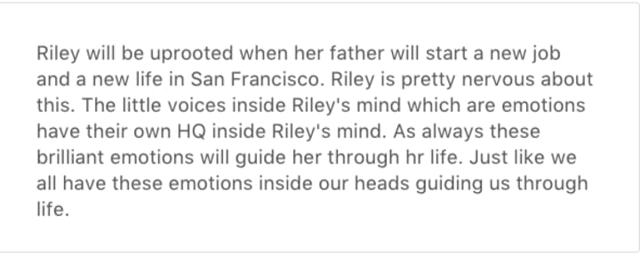 Have you ever wondered what is going on in your head and who might be in your head? In this new Disney film we will see inside the mind of a young girl called Riley Anderson. 5 emotions in her head: Joy, Anger, Disgust, Fear and Sadness are there to lead Riley through her life.