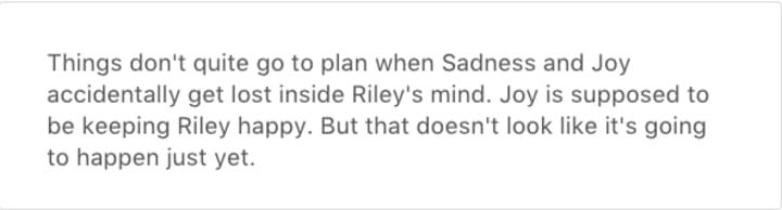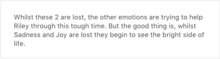 Sadness is a key point in life. We all grow sad at some point in life. It's natural. Riley grows quite upset when she has to move and start a new life in San Francisco. Sadness will slide into action as they try to put a stop to this.