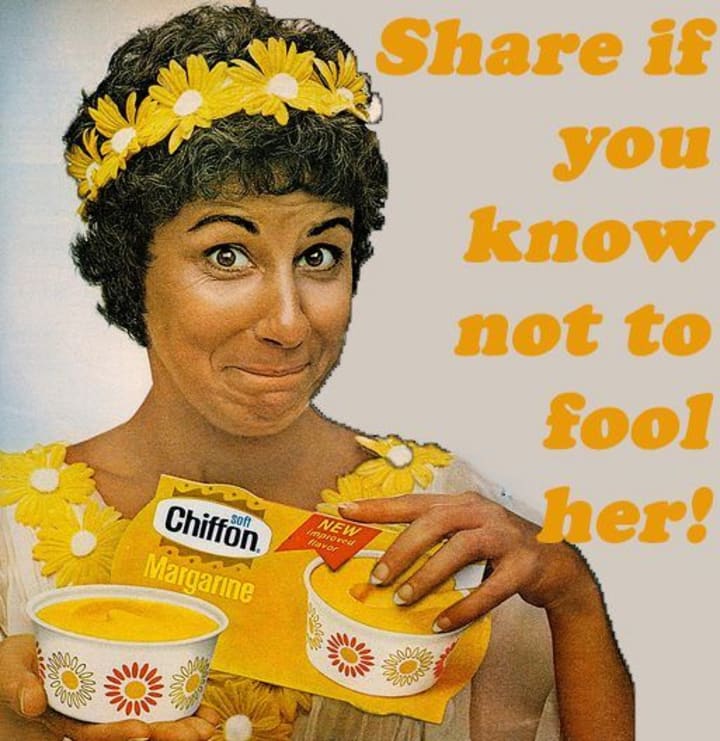 Did you know it was not nice to fool Mother Nature? Well if you didn't during the 1970 American actress Dena Dietrich portraying Mother Nature informed you of this. She told everyone that Chiffon Margarine was a tasty, sweet, creamy spread and was better to be enjoyed than butter or regular margarine.