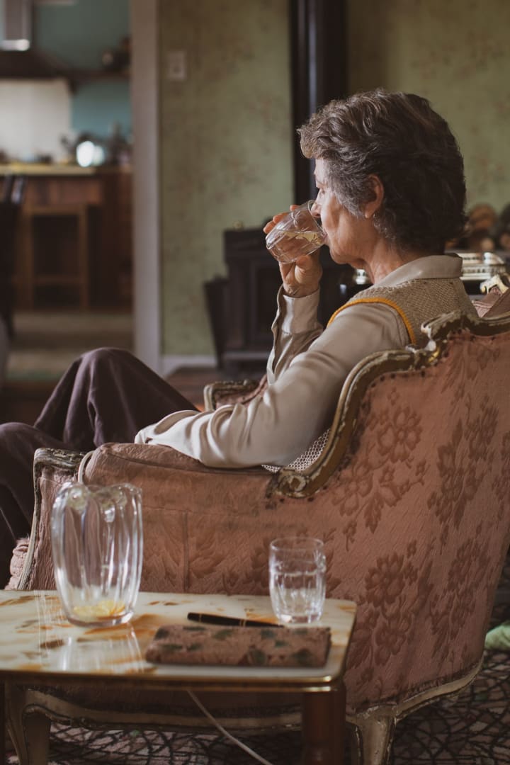 When Sam gets himself suspended from his private school, following a fight during a rugby game, he's sent back home where his father, Robert (Martin Csokas), enlists him to help Ruth's nurse, Sarah (Edith Poor), care for Ruth. Things get off to a contentious start to say the least. Ruth is slowly drinking herself to death. She has a pitcher of Gin, cut with a little water and lemon, next to her at all times. When Sam attempts to limit the amount of Gin in this mixture, he ends up getting a glass tossed at his which leaves a little scar.