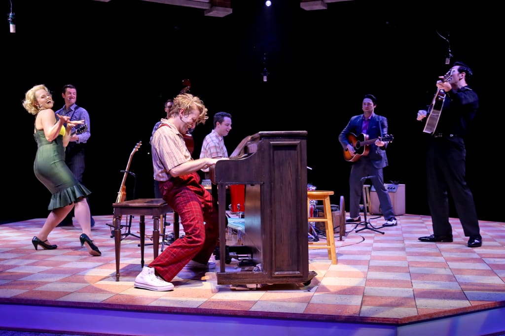 The stage of NSMT is set up to resemble the Sun Records recording studio. The impressive lighting design creates an intimate setting, especially for their concert scenes. A drum set, piano, and guitars sit onstage when audiences walk in. These instruments are the most significant part of the show. All actors perform live onstage.