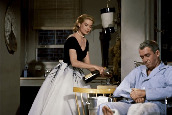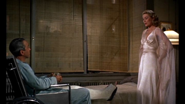 Rear Window also toys with our cultural perceptions of major movie stars. Jimmy Stewart is still regarded today as a bastion of mid-20th century virtue. Plain spoken, humble, and righteous, Stewart is the last man you’d cast as a pervert or as a man of anything less than impeccable virtue. This cultural perception is used against us in Rear Window as we meet Stewart as the character L.B ‘Jeff’ Jeffries. Jeff is confined to a wheelchair via a pretty nasty injury and spends his days staring out the window of his New York City apartment watching his neighbors as if they were channels on a wall of televisions. We see this as harmless simply because he’s Jimmy Stewart. Put a different actor in this position and it might be seen for what it is, creepy voyeurism. But it's different when Jimmy Stewart does it, right?