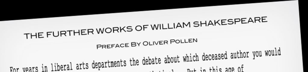 The stakes have always been low, of course, because until now such debates have been purely hypothetical. But in this age of sophisticated organic fabrication and discreet genome compositing, the matter of lunch is eclipsed by a far more ominous question — lunch and then what? I submit this remarkable digital volume as one potential answer. For the moment, let's ignore the murky ethics and arcane sciences that have brought about The Further Works of William Shakespeare; the cultural significance of the four plays, six essays, and one television pilot script collected here simply cannot be argued against.