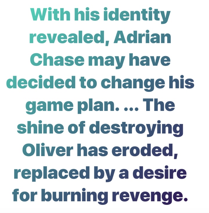 With his identity revealed, Adrian Chase may have decided to change his game plan, especially since Adrian can't be anything other than a fugitive now. The shine of destroying Oliver has eroded, replaced by a desire for burning revenge to end the one man who has turned the tables on Adrian.