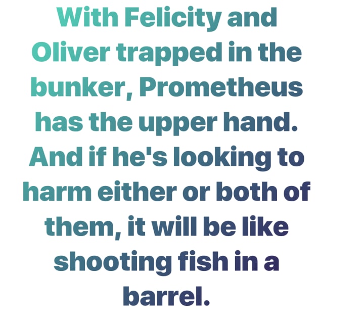 With Felicity and Oliver trapped in the bunker, Prometheus has the upper hand. And if he's looking to harm either or both of them, it will be like shooting fish in a barrel.